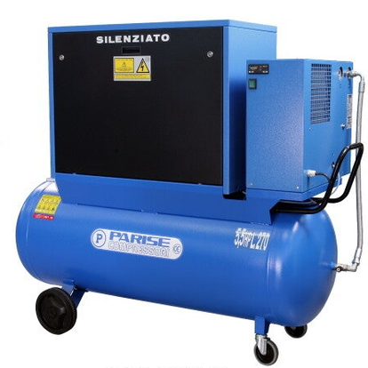 Monta un motore elettrico ad induzione con una potenza di 2 HP, ha una capacità di aspirazione aria compressa di 240 litri d'aria al minuto, può esprimere una pressione massima di 8 bar.